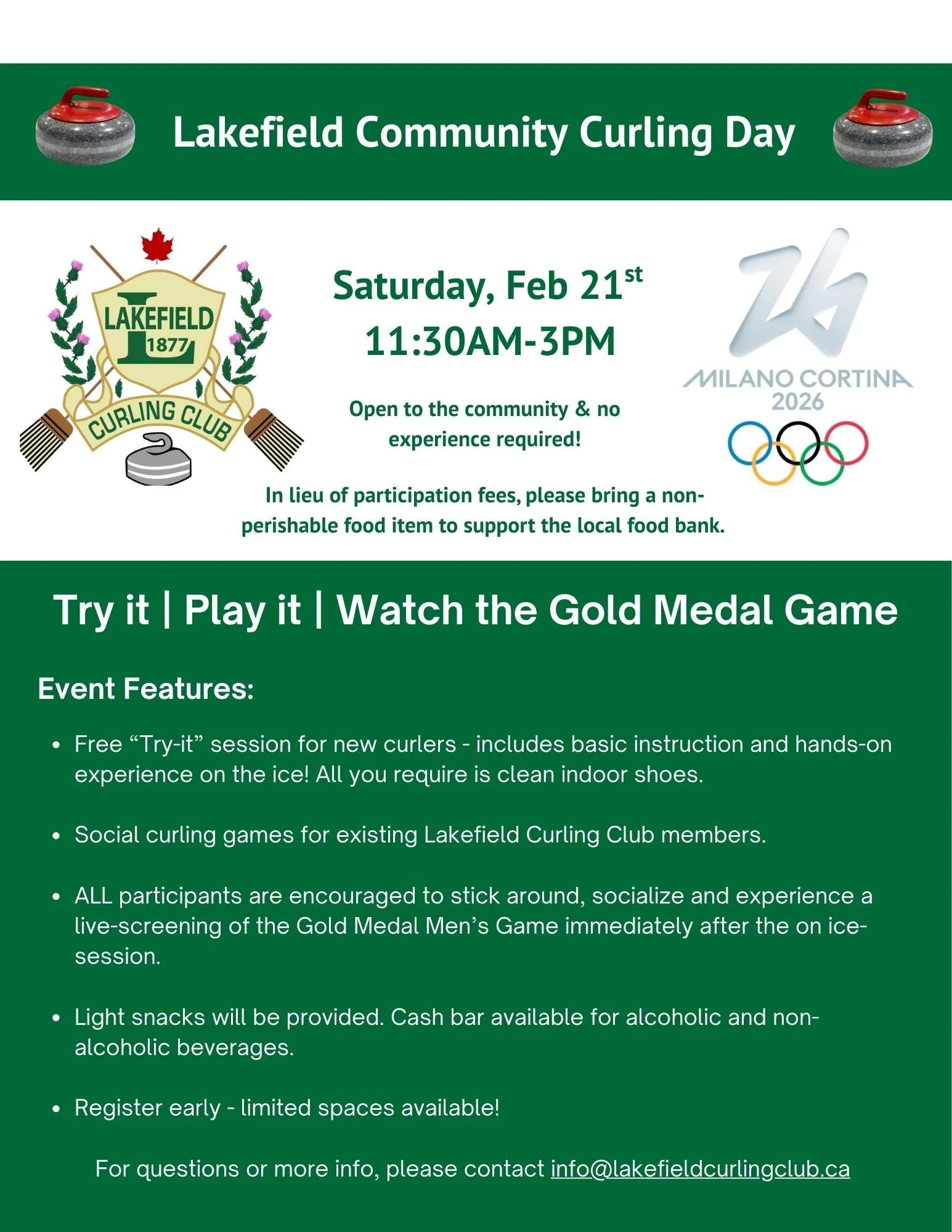 Register early as space is limited. Contact the Lakefield Curling Club for more information: info@lakefieldcurlingclub.ca.