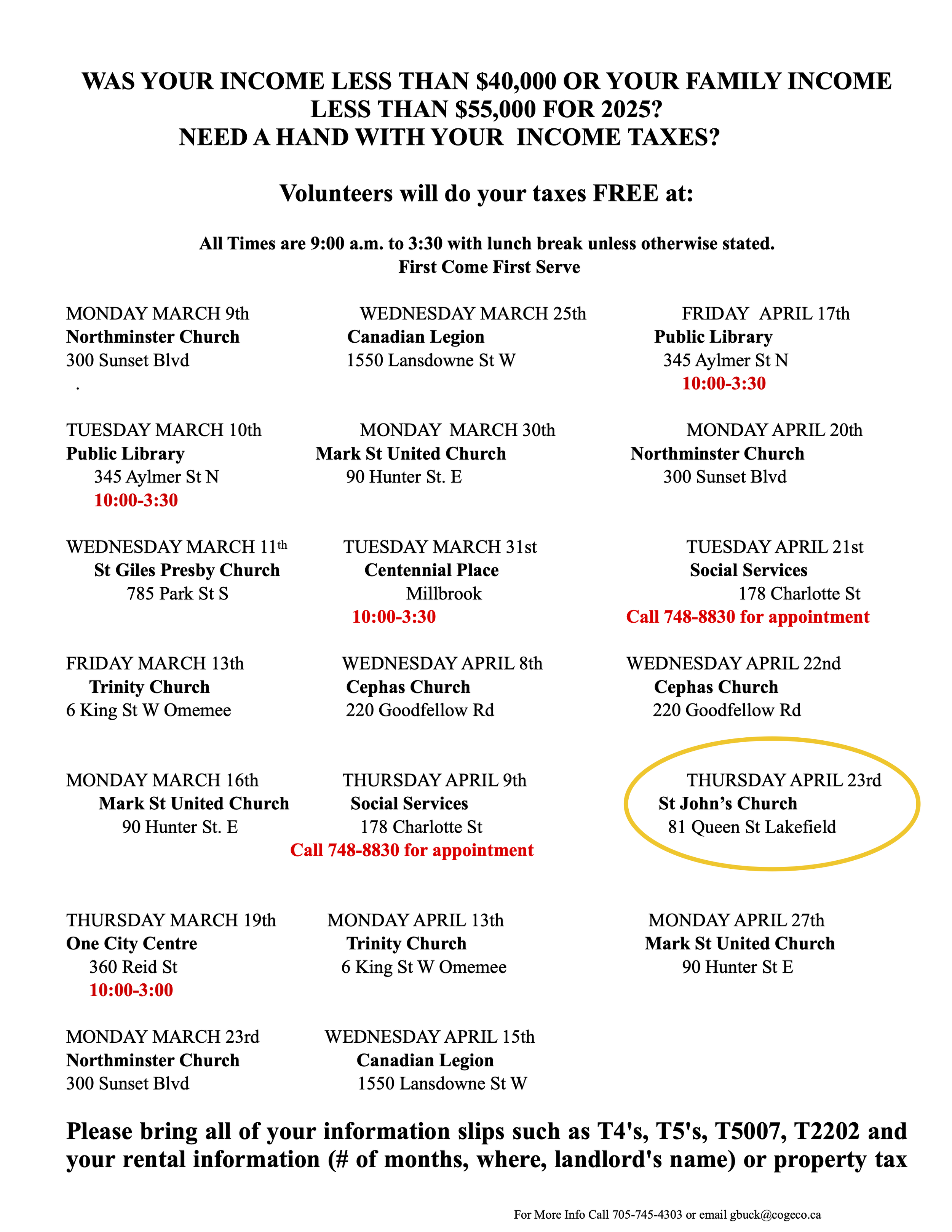 Volunteers will do your taxes for FREE at St. John’s Church, 81 Queen St., Lakefield